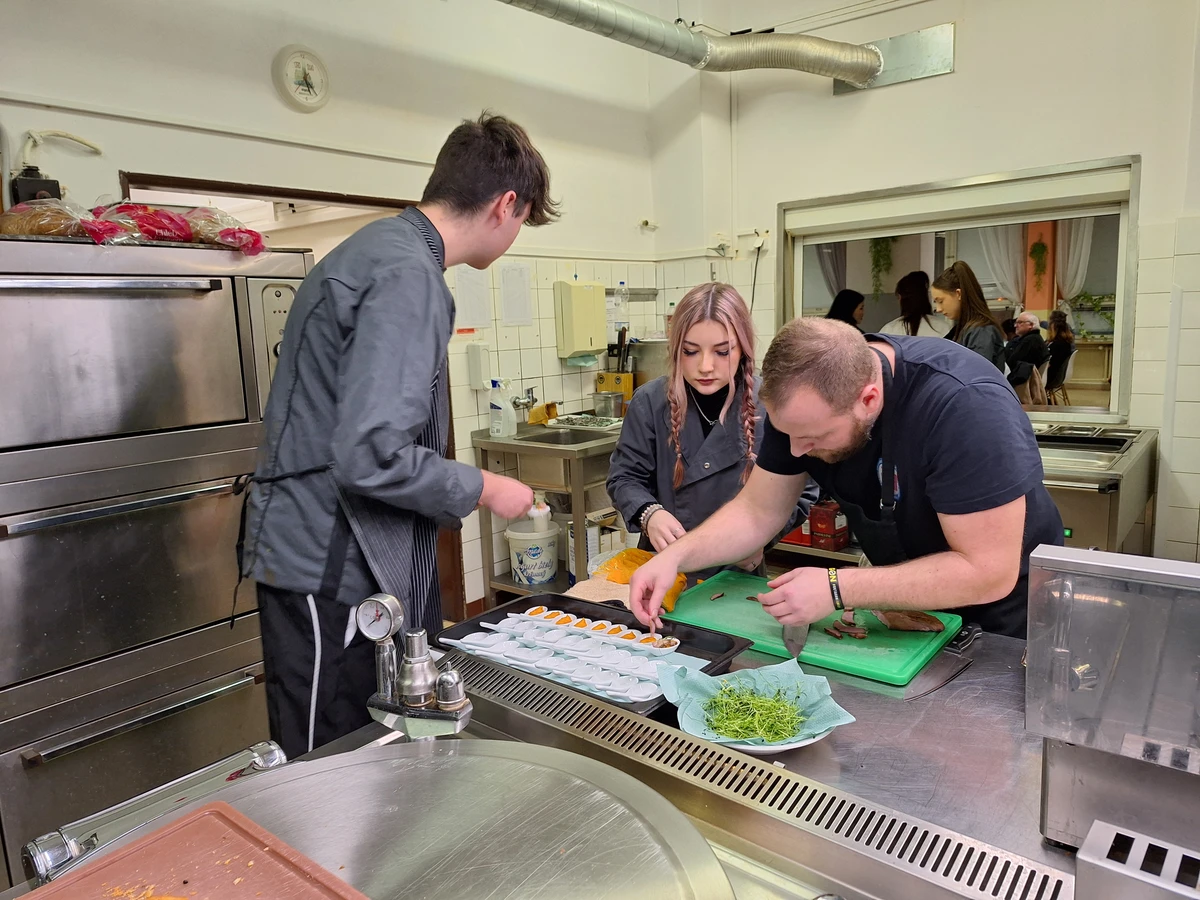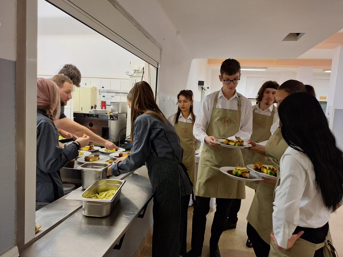 A další akce, která se uskutečnila u nás na škole. Žáci třetího ročníku Hotelnictví dne 11.1.2024 připravili pro své učitele a zaměstance školy banketní večeři v Salonku AHCR. Vařilo se 4-chodové menu, které všem moc chutnalo. Žáci si vyzkoušeli řízenou obsluhu a představení jednotlivých chodů a vín, které se k jídlu skvěle hodily.