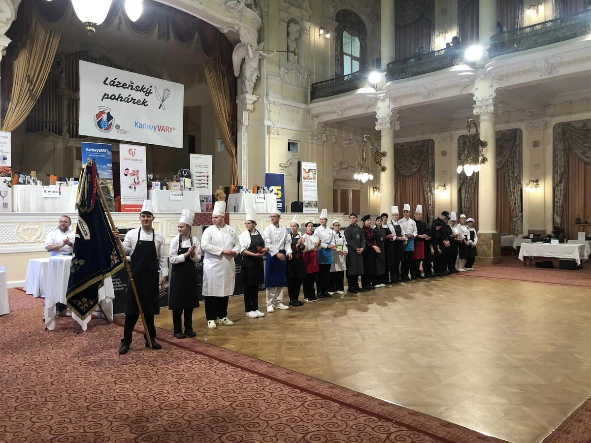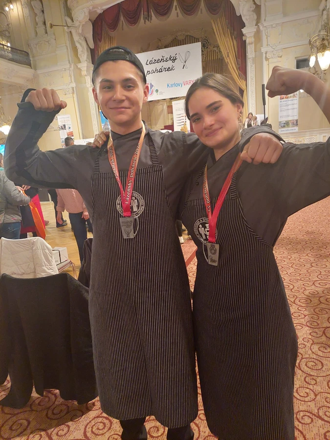 Byli jsme úpěšní! Dne 17. 1. 2024 se žáci ze třídy HT2 (obor Hotelnictví) Samuel Meen a Karina Huminská zúčastnili nejstarší juniorské kuchařské soutěže v ČR, Lázeňského pohárku v Karlových Varech. Soutěž probíhala v ikonických prostorách sálu Grandhotelu Pupp.