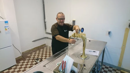 Pan technik Luděk Krejčí z Plzeňského Prazdroje vše zkontroloval a připravil pro výuku, nicméně k dosažení spokojenosti s plně vybavenou demonstrační místností nám ještě zbývá mnoho práce na rekonstrukci a dovybavení učebny. Máme kvalitní základ: Výčepní pult je osazen dvěma narážeči, mycí hlavou a jako tlačný plyn používá Biogon směs CO2 a N2 v poměru 50:50, aby pivo bylo živé a pitelné. Python a všechna další vedení jsou nově provedená. Standardně budeme při výuce čepovat Birell, výjimečně Prazdroj.