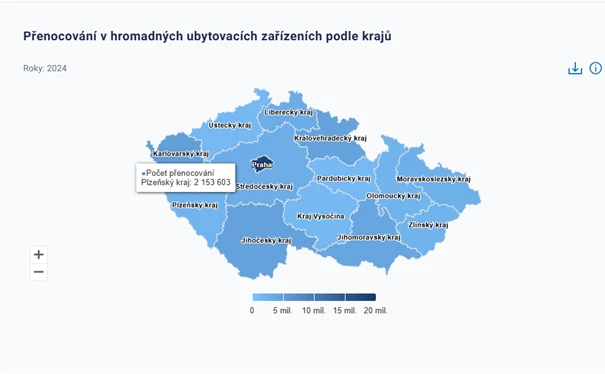 Podle předběžných údajů Českého statistického úřadu se v roce 2024 v hromadných ubytovacích zařízeních ubytovalo více než 22,8 milionu hostů, kteří zde strávili přes 57 milionů nocí. To představuje meziroční nárůst o 3,8 % v počtu hostů a o 2,6 % v počtu přenocování.