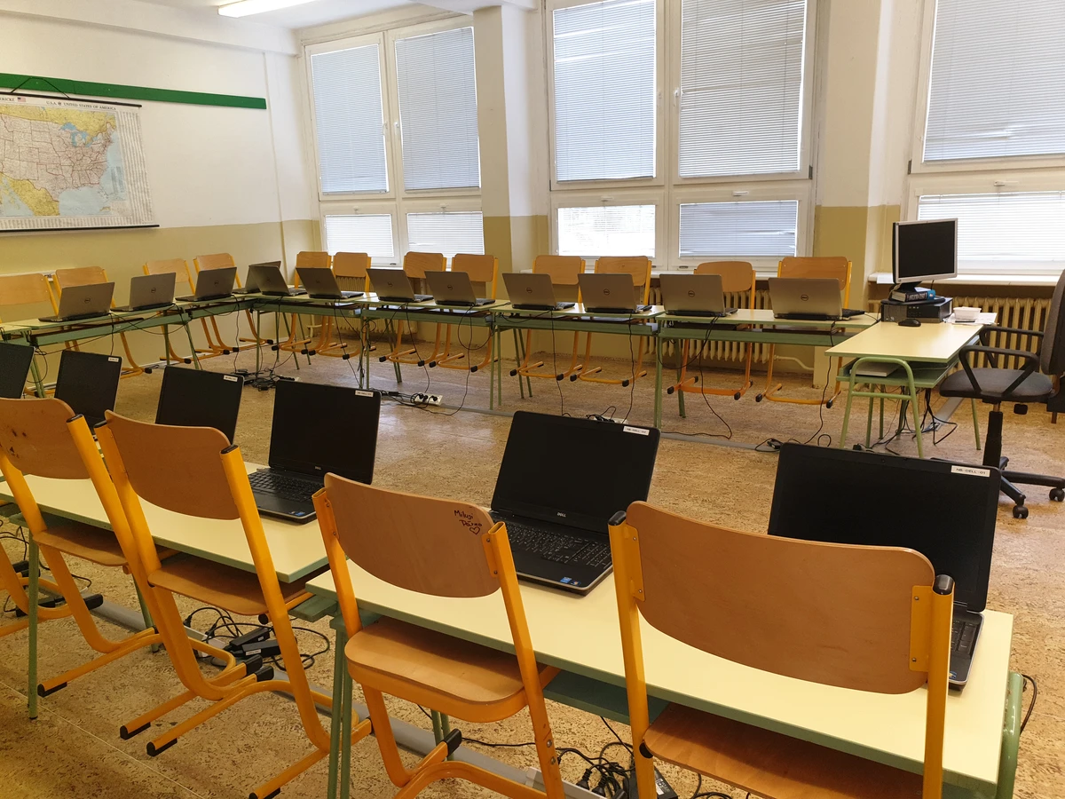 Naše jazykové učebny jsou specifické svým uspořádáním lavic do „U“, což umožňuje perfektní interakci jak mezi žáky a vyučujícím, tak i mezi žáky samými. Toto uspořádání napomáhá různým činnostem, mimo jiné i konverzacím. V učebně anglického jazyka jsou navíc k dispozici pro všechny žáky notebooky, které žáci mohou použít k různým aktivitám, např. při hraní Kahootu či vyhledávání informací.