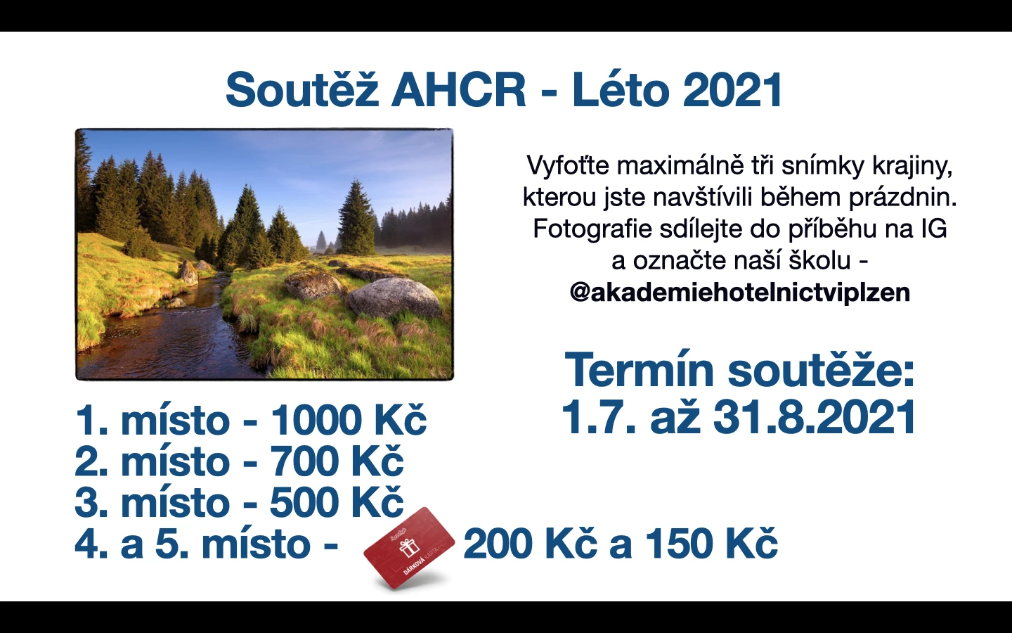 Vyfoťte maximálně tři snímky krajiny, kterou jste navštívili během prázdnin. Fotogragie sdílejte do příběhu na IG a označte naší školu - @akademiehotelnicvtiplzen