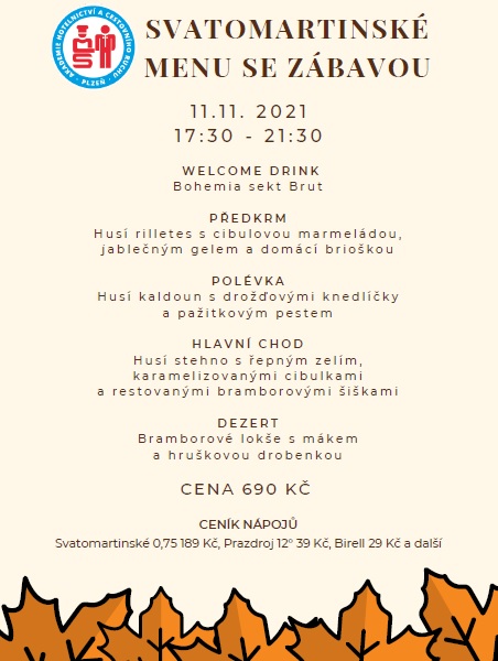11. 11. proběhne v salonku školní jídelny tradiční podzimní gastronomická slavnost a to Svatomartinská husa se Svatomartinským vínem 2021. Prosím, přijměte pozvání na tuto akci, kde naši studenti pod vedením zkušených odborných kantorů uvaří čtyř chodové tematické menu, které budou stejně tak servírovat. Akce je určena pro rodiče a rodinné příslušníky našich žáků nebo pro přátele školy. Kapacita školního salonku je však omezená, pouze 24 míst. Cena menu včetně welcome drinku je 690 Kč, láhev Svatomartinského vína z vinařství Habánské sklepy nebo Víno Mikulov vám bude k dispozici za přátelských 189,- Kč. Na tuto akci je nutné si předem udělat rezervaci na emailu: martin.hermanek@hotelovka-plzen.cz
