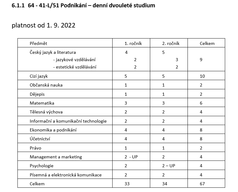 Učební plán studijního oboru 64-41-L/51 Podnikání, denní studium